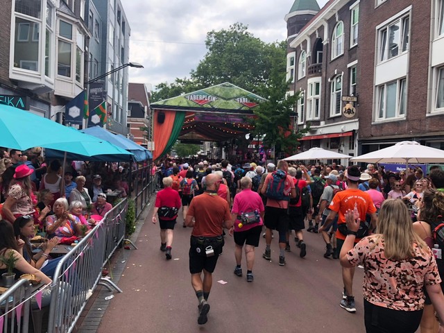 Sportief Wandelroep Zoetermeer heeft twee afvallers na de tweede dag van de Wandelvierdaagse van Nijmegen. Omdat het Roze Woensdag was, hadden ze allemaal een roze polo aangetrokken. De blaren zijn gisteravond weer goed behandeld en goed uitgerust begon de groep donderdag aan de derde dag.