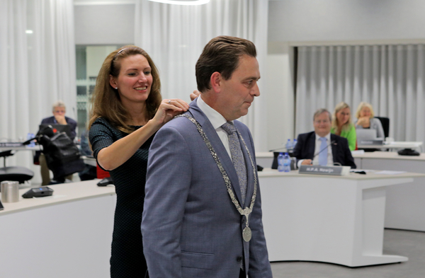 | Zijn vrouw Nicole Bezuijen, de enige aanwezige in de zaal die binnen de 1,5 meter afstand mocht komen, hing de net benoemde burgemeester de ambtsketen om, okt 2020. | Op de fiets kennis maken met de wijken, oktober 2020 |
