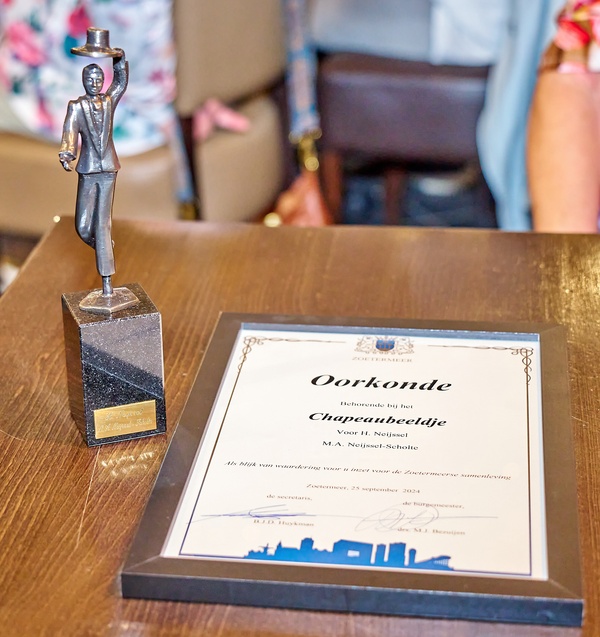 De oprichters van Stichting Maja Anjohuis hebben van de gemeente Zoetermeer een Chapeaubeeldje gekregen als dank voor hun inzet voor het ontmoetingspunt voor kankerpatiënten. Burgemeester Michel Bezuijen verraste Maja en Henk Neijssel met het speciale beeldje tijdens een ingelaste bestuursvergadering.