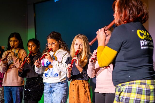 Samen met de schoolleiding, vakdocenten en een volle zaal enthousiaste ouders. Na zes weken oefenen, ontdekken en samen muziek maken, lieten de kinderen aan ouders, verzorgers en andere belangstellenden zien dat zij een optreden konden verzorgen op hun instrument en vormden zij uiteindelijk één groot orkest, compleet met viool, blokfluit, ukelele, dwarsfluit, gitaar, cello en meer.