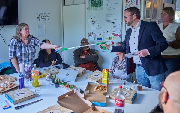 De deelnemers aan de Pizza en Prikavonden in Buytenwegh, die al minimaal drie keer hebben meegedaan aan de actie, hebben een dinerbon gekregen. Wethouder Bouke Velzen pakte de prikstok om alle deelnemers de bon te overhandigen.