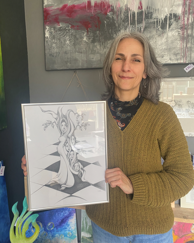 Voor wat afwisseling werkt Daphne soms met hout, steen en andere natuurlijke materialen om beelden en sieraden te maken. Daarnaast waagt ze zich ook weer aan schilderijen. "Ik schilderde de laatste tijd niet zoveel, maar nu heb ik het weer opgepakt. Hier zie je meer kleurgebruik, wat lastig is vanwege de vele keuzes. Met potlood kun je opbouwen en weer gummen, wat heel prettig is, maar bij kleur is dat lastiger," legt Daphne uit.